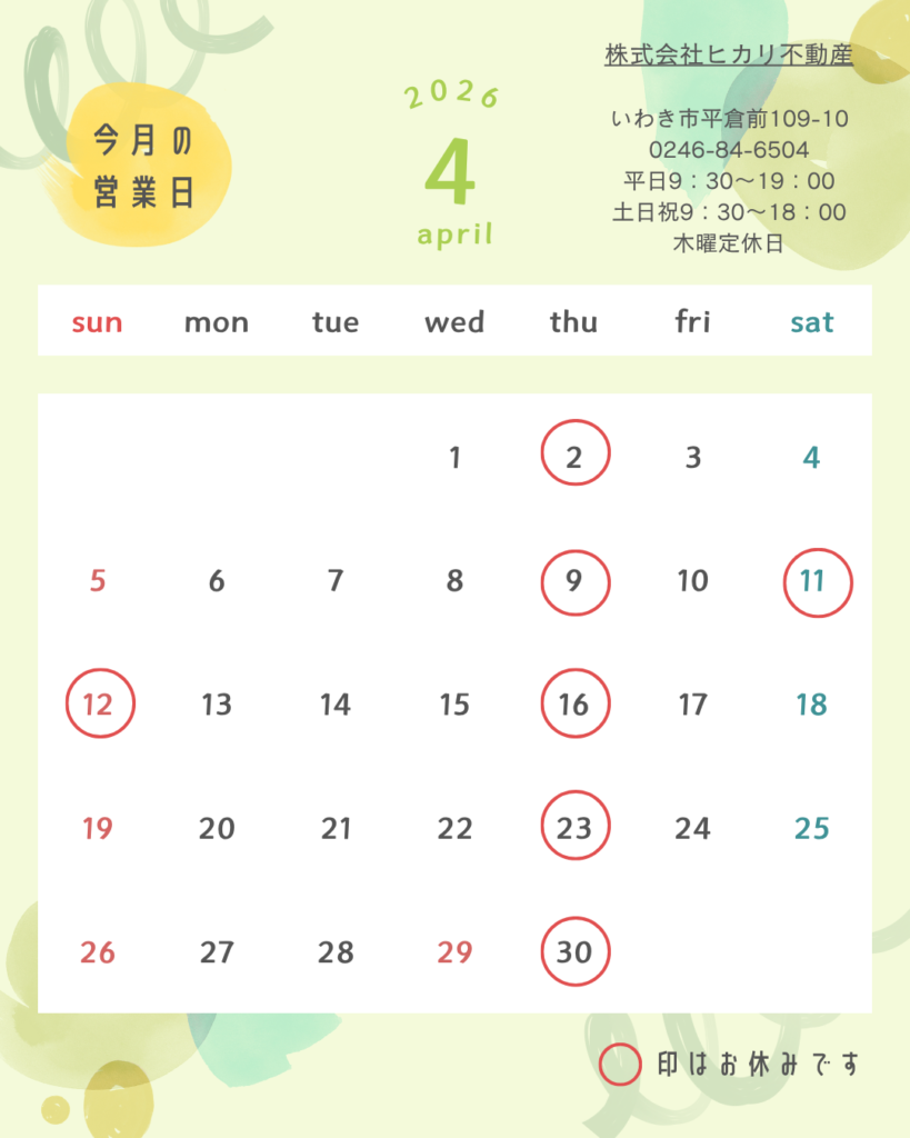【4月営業日のお知らせ】 春のやわらかな暖かさが心地よく、新しい生活が本格的にスタートする季節となりました。 いわき市内でも、入学式や新社会人の姿を見かける機会が増え、街全体がフレッシュな空気に包まれています。 そんな中、春の訪れを感じる嬉しいニュースが届きました。 いわき市では、3月27日に桜(ソメイヨシノ)の開花が発表されました。観測地点となったのは旧小名浜測候所の標本木で、かつて気象台が開花の目安としていた桜です。市民団体により10輪以上の開花が確認され、正式な開花宣言となりました。平年より8日早く、昨年よりも1日早い観測となり、今年は少し早めの春の訪れとなっています。 街を彩る桜とともに、新生活が動き出すこの季節。3月も多くのご来店・お問い合わせをいただき、誠にありがとうございました。お部屋探しのピークを迎える中で、多くのお客様とのご縁をいただけたこと、心より感謝申し上げます。 4月は、新しい環境での生活が始まる大切な時期です。住まいは、日々の安心や快適さを支える基盤となる存在です。だからこそ当社では、お一人おひとりのライフスタイルやこれからの過ごし方に寄り添いながら、最適なご提案を心がけております。 現在は3月ほどの急激な動きは落ち着いているものの、人気エリアや条件の良い物件は引き続き早く決まる傾向にあります。「まだ具体的に決まっていない」という段階でも問題ございません。エリアごとの特徴や通勤・通学のしやすさなど、暮らしに関するご相談もお気軽にお声がけください。 また、店頭でのご案内に加え、オンラインでのご相談やご契約にも引き続き対応しております。遠方にお住まいの方やお忙しい方でも、安心してお部屋探しを進めていただけます。 新しい季節、新しい暮らしのスタート。その大切な一歩を、心を込めてお手伝いさせていただきます。 4月もどうぞよろしくお願いいたします。